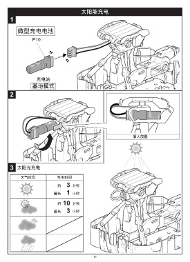 太陽能充電 1 微型充電電池 P10 充電站 基地模式 2 插入放置 3 太陽光充電 天氣狀況 充電時間 約 3 分鐘 最長 1 小時 約 10 分鐘 最長 3 小時 12