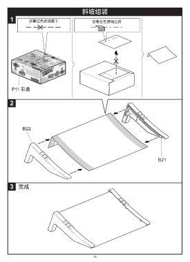 斜坡組裝 1 沿著紅色虛線剪下 沿著白色虛線壓折 P11 彩盒 2 B22 B21 3 完成 15