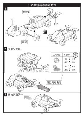 小轎車組裝與遊戲方式 1 齒輪箱 A2 B17 前輪 2 太陽光充電 天氣狀況 充電時間 約 3 分鐘 最長 1 小時 約 10 分鐘 最長 3 小時 微型充電電池 3 開始奔跑囉~~ 16