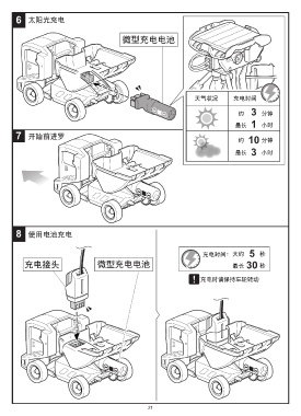 6 太陽光充電 微型充電電池 天氣狀況 充電時間 約 3 分鐘 最長 1 小時 7 開始前進囉 約 10 分鐘 最長 3 小時 8 使用電池充電 充電時間:大約 5 秒 充電接頭 微型充電電池 最長 30 秒 充電時請保持車輪轉動 21
