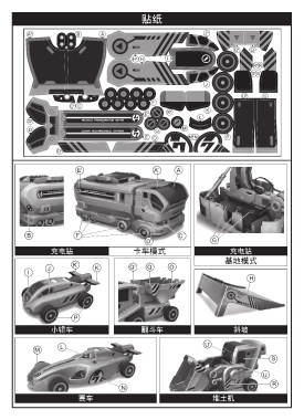 貼紙 E’ A’ A B F C’ D’ G 充電站 卡車模式 充電站 基地模式 K’ J K Q’ Q O I H P 小轎車 翻斗車 斜坡 M L U’ S U R N 賽車 堆土機