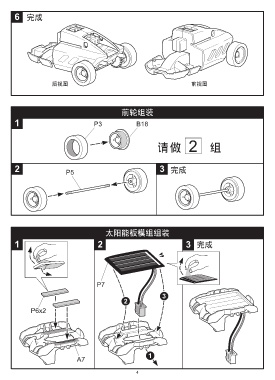 6 完成 后視圖 前視圖 前輪組裝 1 P3 B18 請做 組 2 2 P5 3 完成 太陽能板模組組裝 1 2 3 完成 P7 3 2 P6x2 1 A7 4